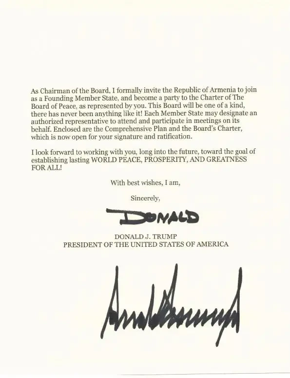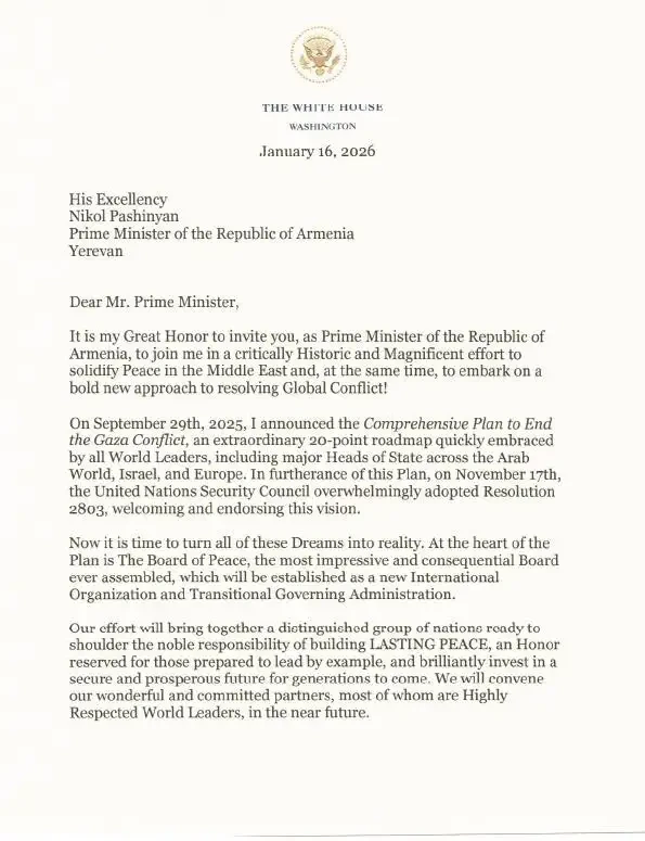 «Վարչապետ Նիկոլ Փաշինյանը ստացել է ԱՄՆ նախագահ Դոնալդ Թրամփի պաշտոնական հրավերը՝ Խաղաղության խորհրդին որպես հիմնադիր անդամ միանալու վերաբերյալ։