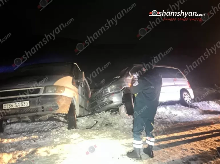 Երևան-Գյումրի ավտոճանապարհին մերկասառույցի պատճառով «Ford Transit»-ը հայտնվել է ձնակույտերի մեջ, ապա «Mercedes Vito»-ն բшխվել է «Ford Transit»-ին