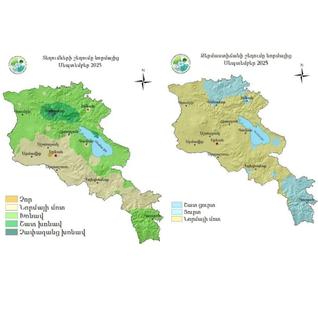 2025年9月亚美尼亚月平均气温为13.1℃,比常年低0.8℃。月降水量44.3毫米,偏多,为常年的140%。这是SNOC“水文气象监测中心”报道的。
