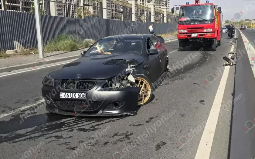 Каскадерская автокатастрофа в Ереване. «БМВ» сломал 2 опоры электропередач и оказался посреди дороги