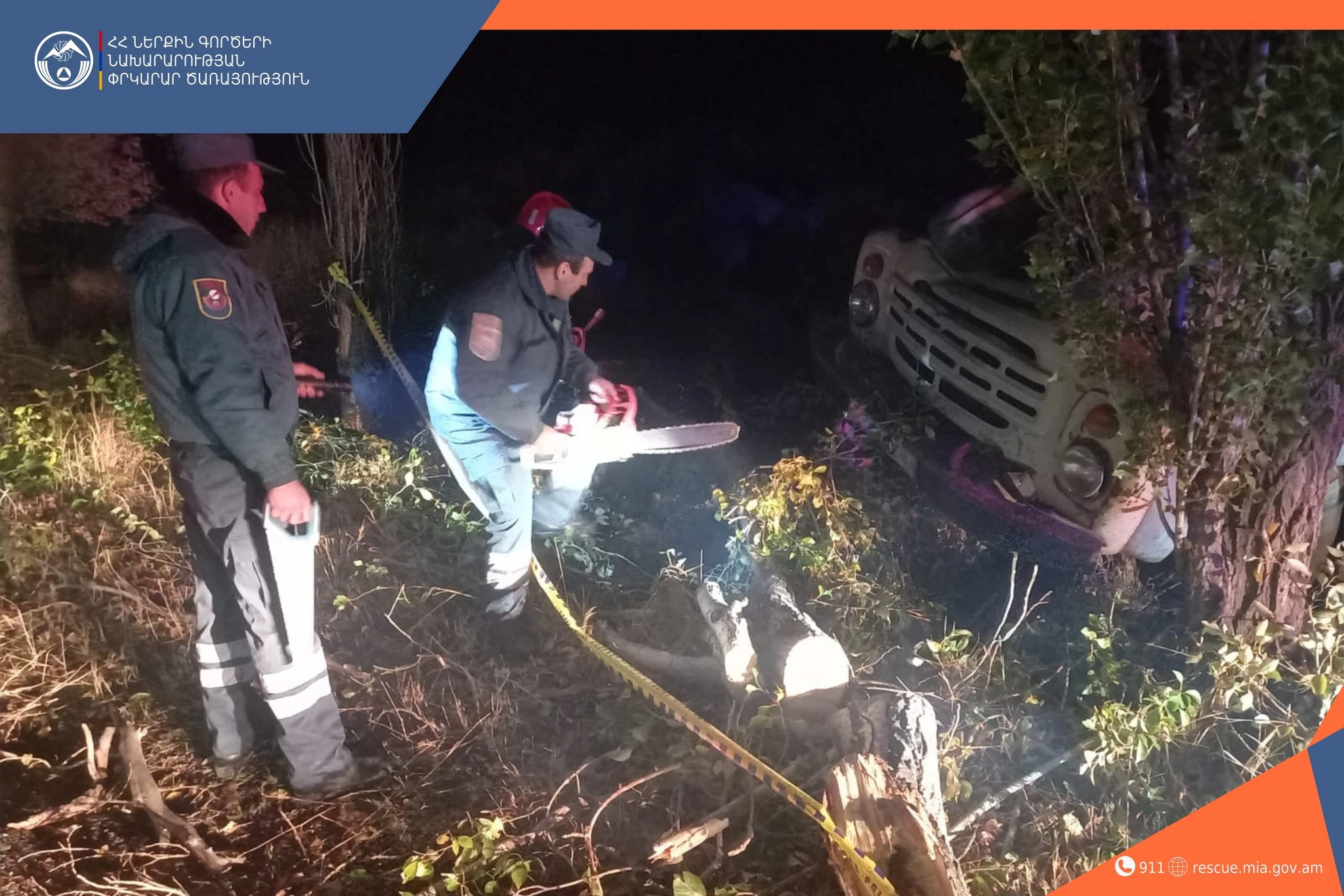 原来,埃里温-塞万高速公路第33公里处,一辆“Zil”卡车(装载石头)驶出公路,在树上发现了他们,遂将其中一辆撞坏。卡车的车身被撕裂,石头脱落,煤气泄漏。目前没有人员伤亡。