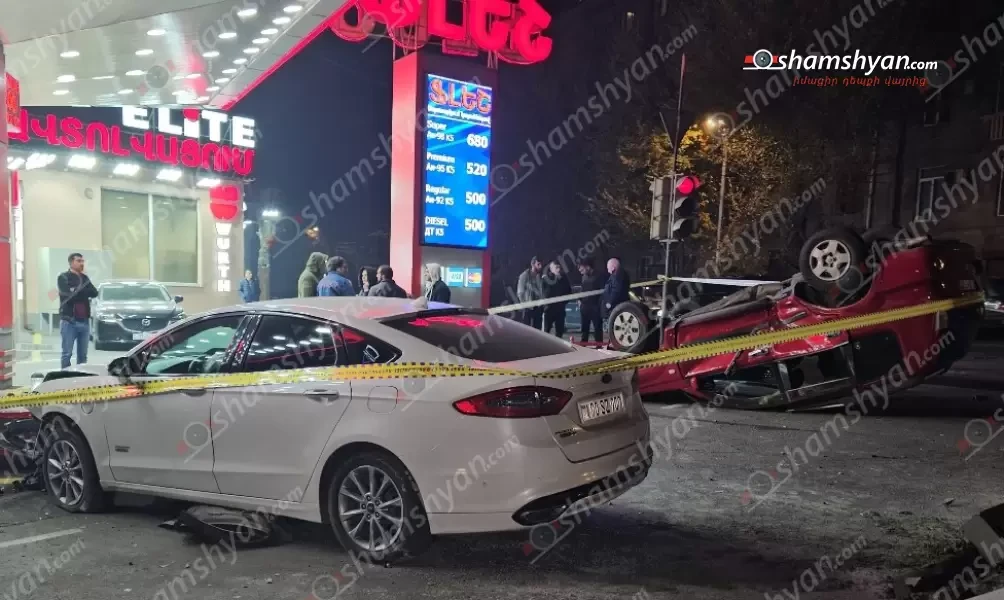 اصطدام سيارتي فورد فيوجن ونيسان إكس تريل في يريفان. انقلبت الأخيرة واصطدمت سيارة الفورد فيوجن بالرصيف البازلتي والحاجز الحديدي لمحطة الوقود
