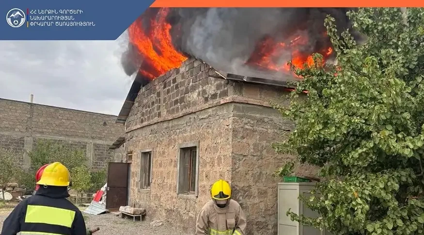 It turned out that the fire broke out in one of the houses on Marshal Baghramyan Street in Artashat (about 180 square meters). The fire was isolated at 15:35, extinguished at 16.31. The roof of the house (about 150 square meters), the kitchen and a corridor (about 30 square meters) were burnt. Firefighters managed to prevent the spread of the fire from the other rooms of the house.