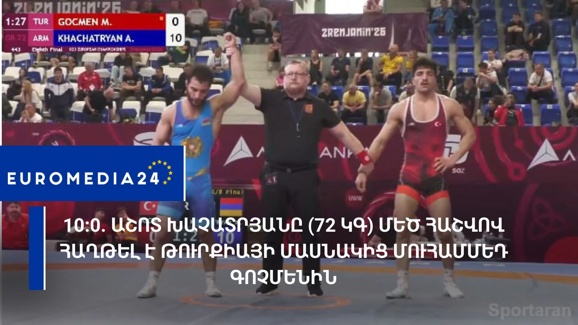 10:0. وفاز أشوت خاتشاتريان (72 كجم) بفارق كبير على المشارك التركي محمد جوشمان.