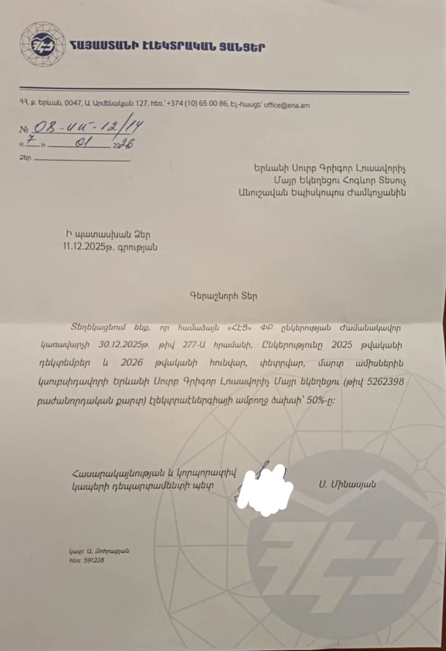 В письме упоминается, что HETC будет субсидировать 50 процентов затрат церкви на электроэнергию в декабре 2025 года, а также в январе, феврале и марте 2026 года.