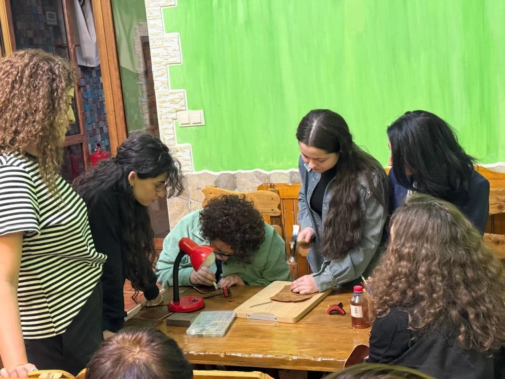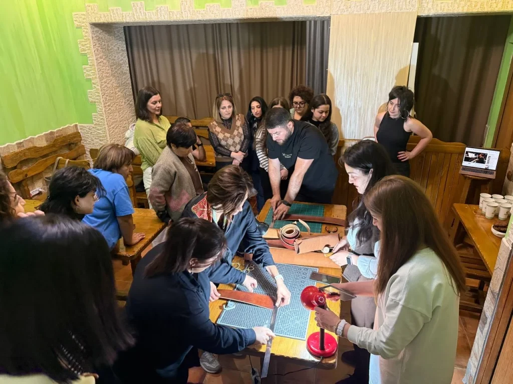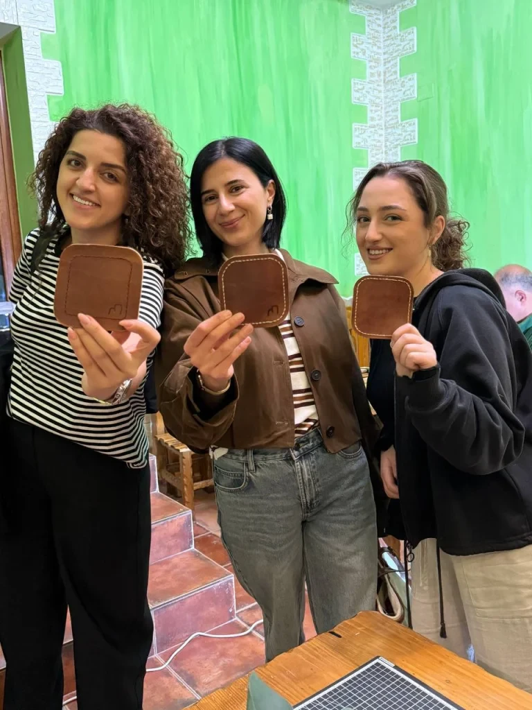 Работа с толстой кожей требует терпения и силы. В этот раз участники решили сделать подстаканники: вырезали форму, пробивали отверстия, с увлечением стучали молотками, прошивали прочной вощёной нитью. Затем Армен показал, как правильно обработать края воском. Завершающим штрихом стал горячий тиснёный оттиск с изображением Татик-Папик — символа Арцаха, воплощающего любовь и стойкость.