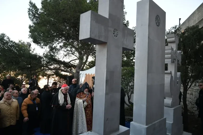 在马赛,天主教卡雷金二世祝圣了一个带有亚美尼亚生命十字架和拉丁十字架的双哈奇卡。